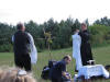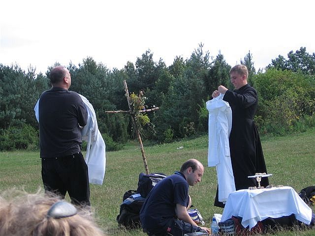 Przygotowania do mszy świętej na wolnym powietrzu przy zamku w Mirowie.